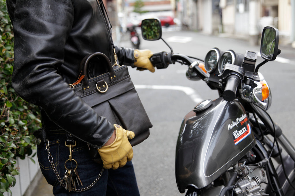 「池田工芸」と兄弟誌『Lightning』による、茶芯の純国産ホースハイドを使ったこだわりのヘルメットバッグ。 モノは確かに惹かれるけど、サイズ的にはバイクに乗るには残っててそうなんですが……。 そんな方にオススメなのがこちらのミニメットバッグです。 デザインは従来のヘルメットバッグを踏襲しつつも、小さなサイズにも違和感なく落とし込みました。ヘルメットバッグにも同様、1.2mm厚のベジタブルタンニンめし・顔料仕上げの馬革を使っています。 日本産の馬の革を使って、日本国内でなめした希少な「純国産」のホースハイドを、一度ブラウンで染めた後にブラックで仕上げることで、使い込むほどに地にブラウンが見え、上がり姿豊かな経年変化をしっかりと堪能してジャケットは大阪にある創業1942年の老舗「ライダースはもちろん、トラベルジャケットやGジャン、ブーツにも相性抜群でアメリカンカジュアル好き、そして好きなハーレー乗りにもぴったり。愛車に乗るときに大切にするカッコいいバッグをお探しのあなた、ミニメットバッグがオススメです!!」