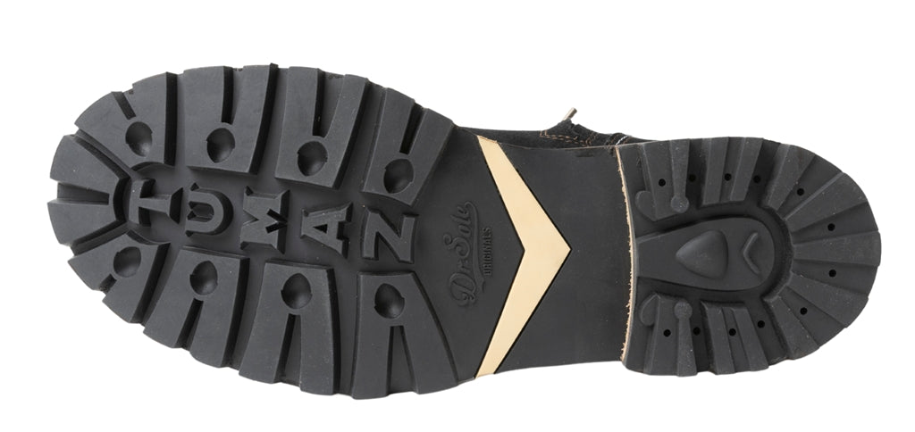 アウトソールはDr.Sole社製のTUMAZ。スーパーグリップラバーコンパウンドを使用したタフなソールです。耐久性と安定性に優れ、アスファルトでのグリップ力が高くバイクの押し引きなどでも実感できるはずです。TUMAZはツキノワグマからインスピレーションを得たモデルで、ソールの中央部分に白いV字のデザインがあるのはそのためです